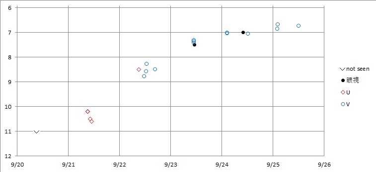 熱心な観測者の皆さんの観測から光度曲線を見ていると おおよそ極大になったのかなあと思われます。6等台後半 ということでまずまず明るい新星になりました。 ただわりあいとゆっくりした新星のようですし、もしか すると予想外の増減光が見られるかもしれません。その意 味ではまだまだ目が離せないですね。 9月も終わりになり観測しづらい時期になってきました が、皆さんどうぞ引き続きよろしくお願いいたします。 高橋 進
